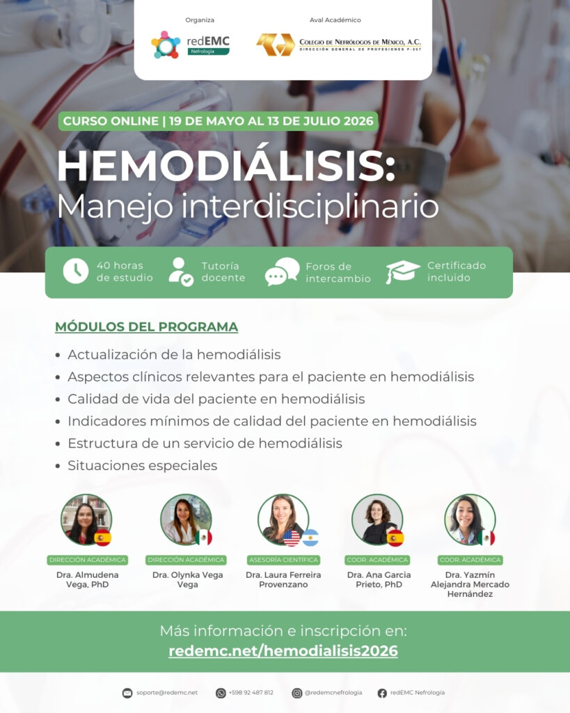 Médico adjunto en Nefrología, Hospital de Universitario “Gregorio Marañón”. Doctora en Medicina por la Universidad Complutense de Madrid. Profesora del Máster de Ingeniería Biomédica de la Universidad Carlos III, del Máster en Técnicas domiciliarias de la Universidad Jaume I y del Máster experto en Hemodiálisis de la Universidad Complutense de Madrid.